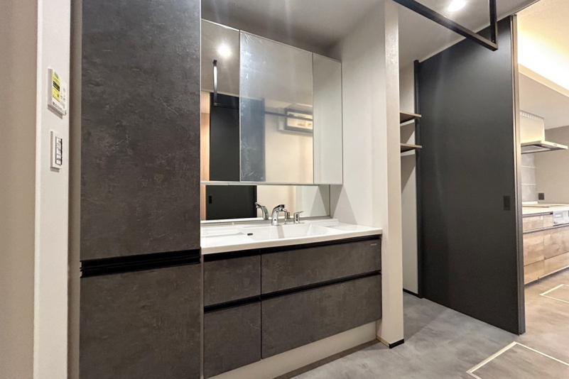 毎日使うハブラシなどの衛生用品や化粧品など、細かなものをそれらのきちんと収納できるミラーキャビネットはLEDライトでお顔映りもバッチリ。またキレイアップ水栓は、水栓が上部にあるので周りに水がたまりにくく、水滴を拭き取るだけで簡単キレイ。