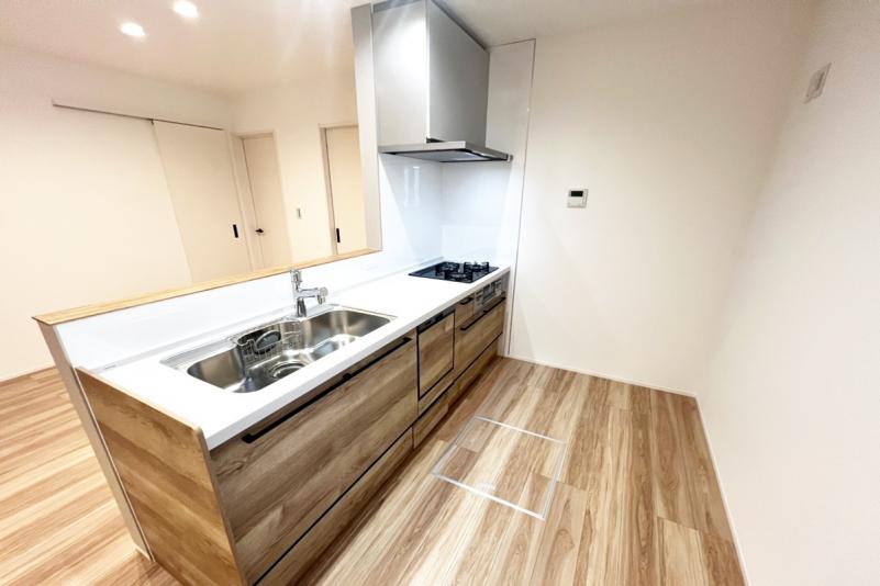 底面は傷が目立ちにくく、奥行きワイドなステンレスシンク。小物置き付きでシンク周りの小物をすっきり収納できます。ストック類や普段使わないものを分類できる機能的な収納のキャビネットはソフトクローズレール仕様で静かにピタッと閉まる、安全な引き出し。