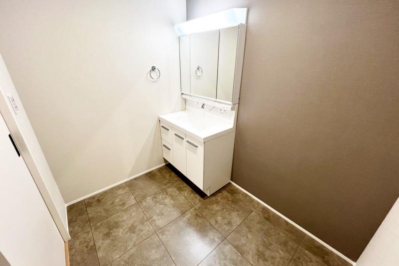 毎日使うハブラシなどの衛生用品や化粧品など、細かなものをそれらのきちんと収納できるミラーキャビネットはLEDライトでお顔映りもバッチリ。またキレイアップ水栓は、水栓が上部にあるので周りに水がたまりにくく、水滴を拭き取るだけで簡単キレイ。