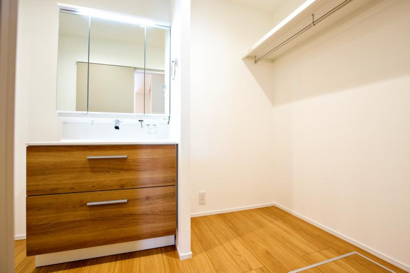 水栓に触れなくても手を差し出すだけでセンサーが感知し自動で水が出る自動吐水、ハンドル操作で手動吐水も可能です。三面鏡のミラーキャビネットはこれまで収納するのが難しかった大きなドライヤーやシェーバーが収納可能に! トレイの高さはお好みに合わせて調節できます。