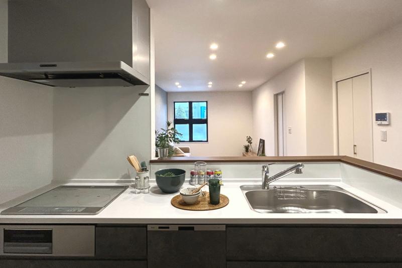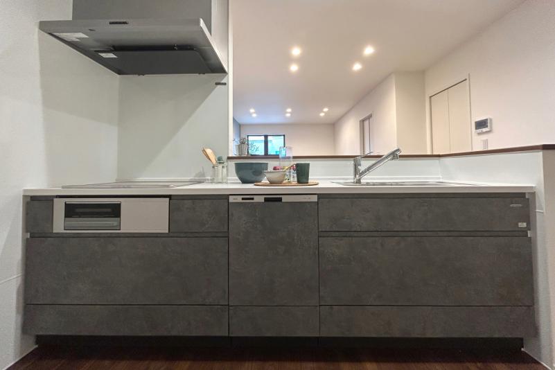 底面は傷が目立ちにくく、奥行きワイドなステンレスシンク。小物置き付きでシンク周りの小物をすっきり収納できます。ストック類や普段使わないものを分類できる機能的な収納のキャビネットはソフトクローズレール仕様で静かにピタッと閉まる、安全な引き出し。