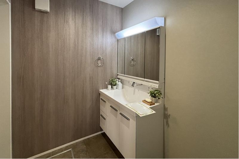 ワイドな高演色タイプLED照明と、汚れが拭き取りやすいクリーンコーティングでいつも美しいミラー。人造大理石ハイバックカウンターはボウル一体型なのでお手入れカンタン。