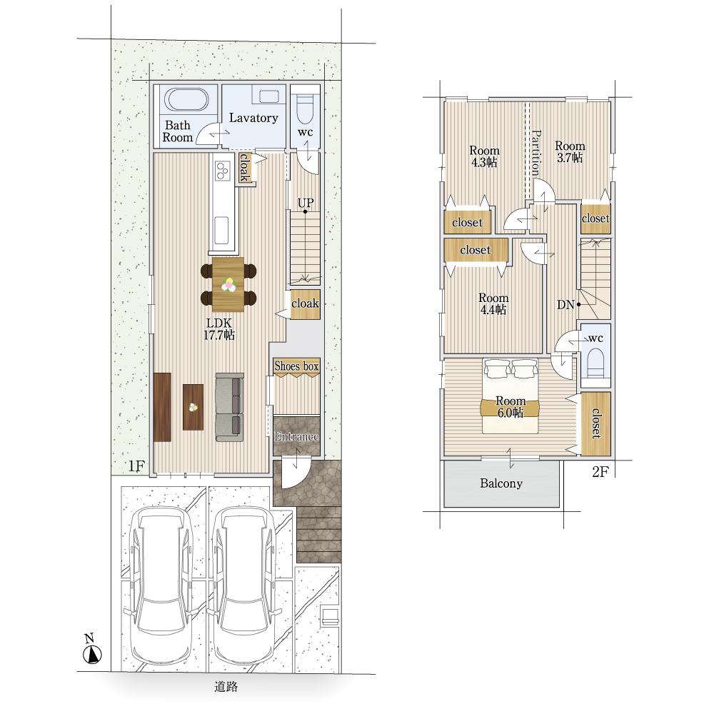2号地は将来的に間仕切りで3LDK→4LDKへ変更可能な間取りで、ライフステージに沿った暮らしができます。