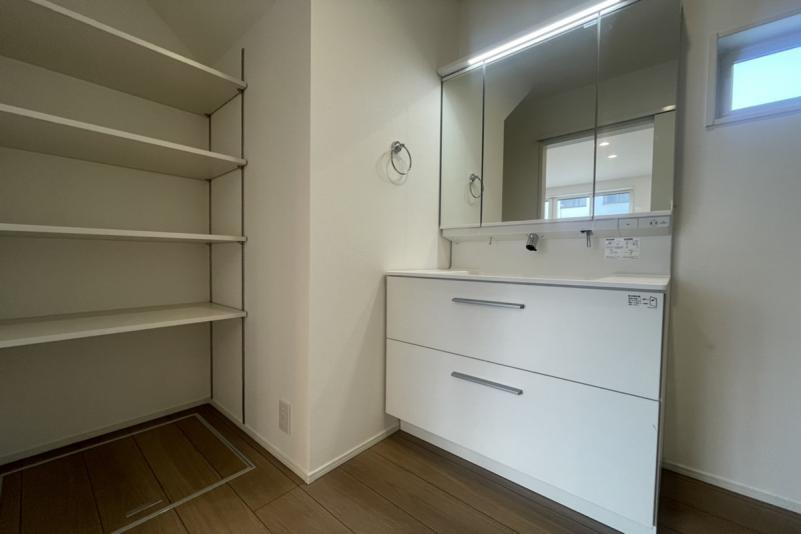 水栓に触れなくても手を差し出すだけでセンサーが感知し自動で水が出る自動吐水、ハンドル操作で手動吐水も可能です。三面鏡のミラーキャビネットはこれまで収納するのが難しかった大きなドライヤーやシェーバーが収納可能に! トレイの高さはお好みに合わせて調節できます。