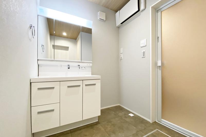 毎日使うハブラシなどの衛生用品や化粧品など、細かなものをそれらのきちんと収納できるミラーキャビネットはLEDライトでお顔映りもバッチリ。またキレイアップ水栓は、水栓が上部にあるので周りに水がたまりにくく、水滴を拭き取るだけで簡単キレイ。
