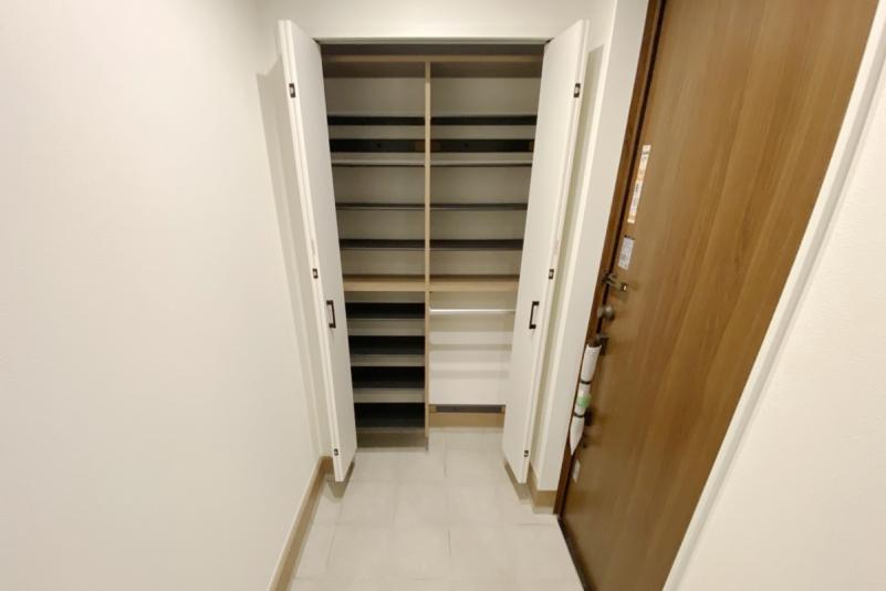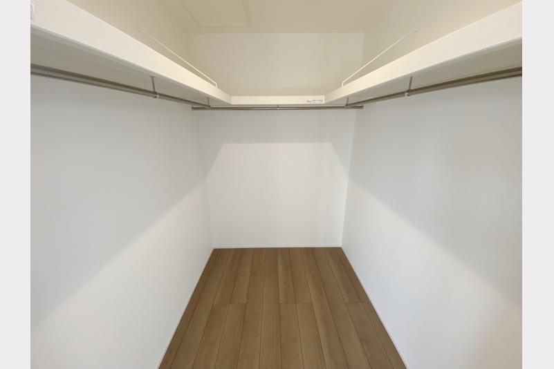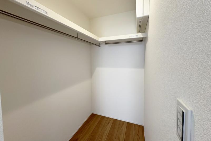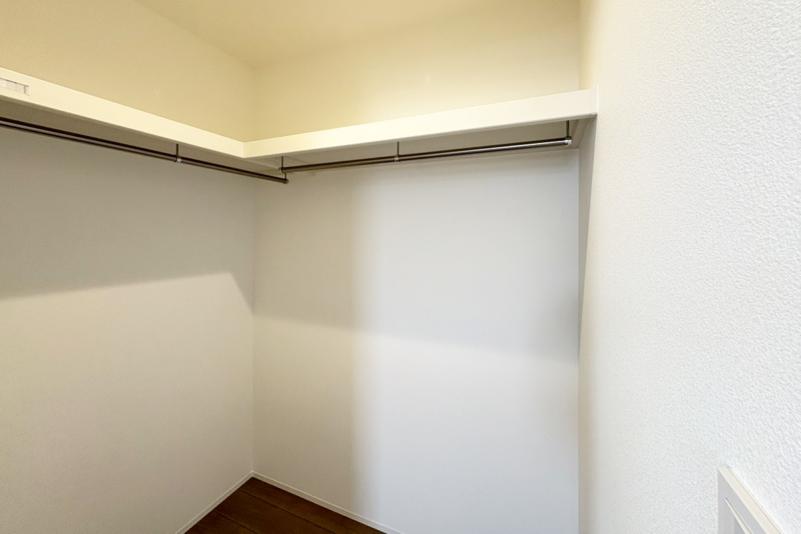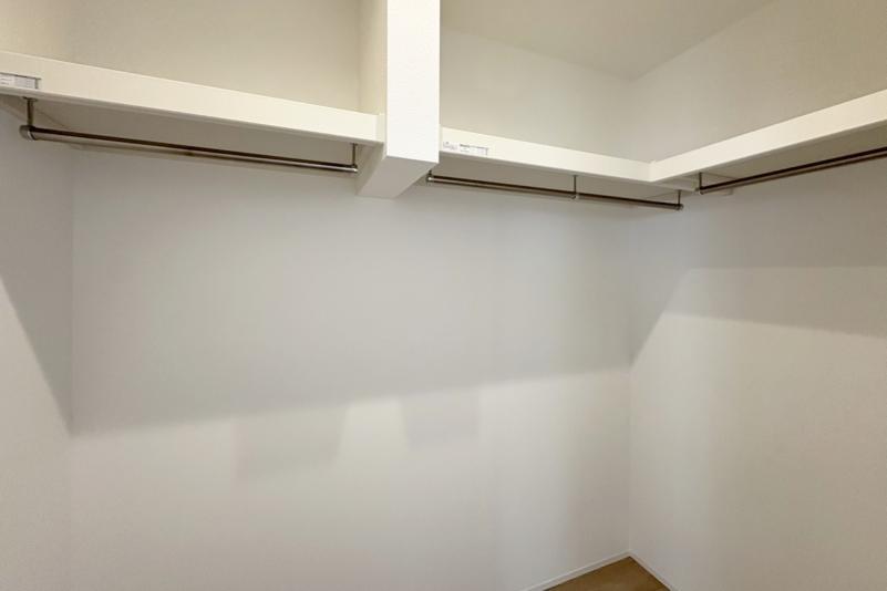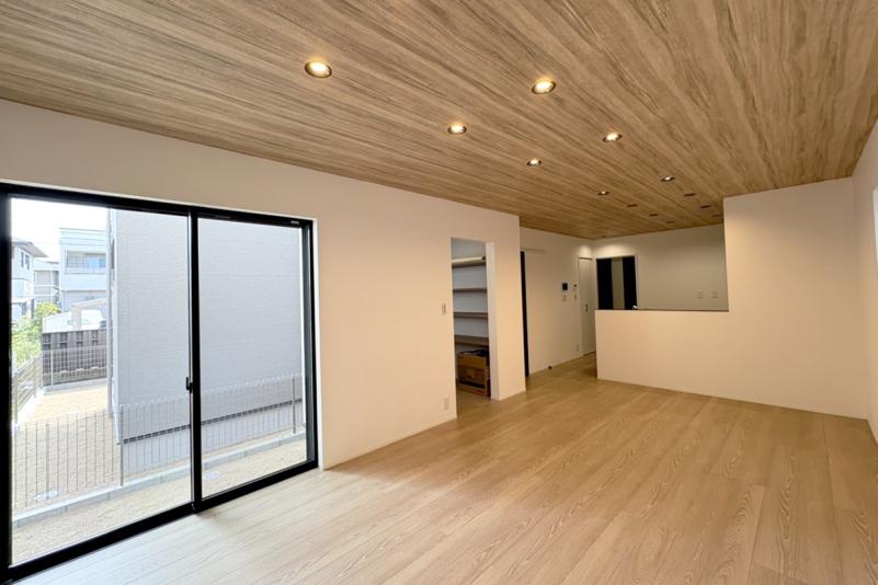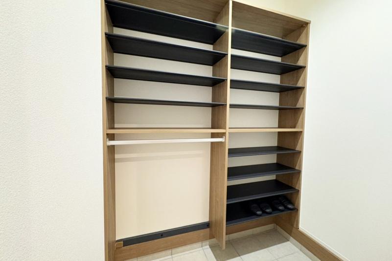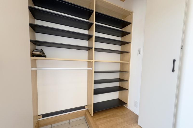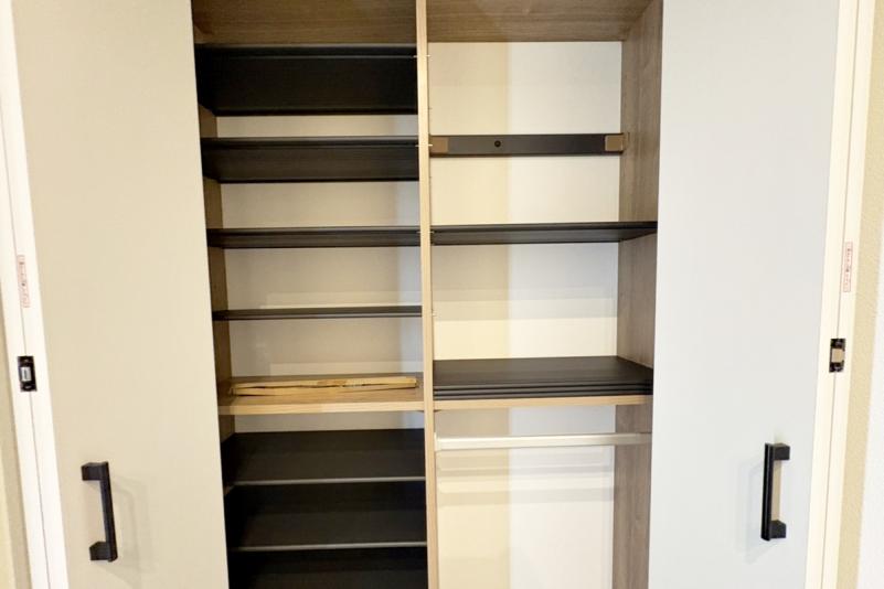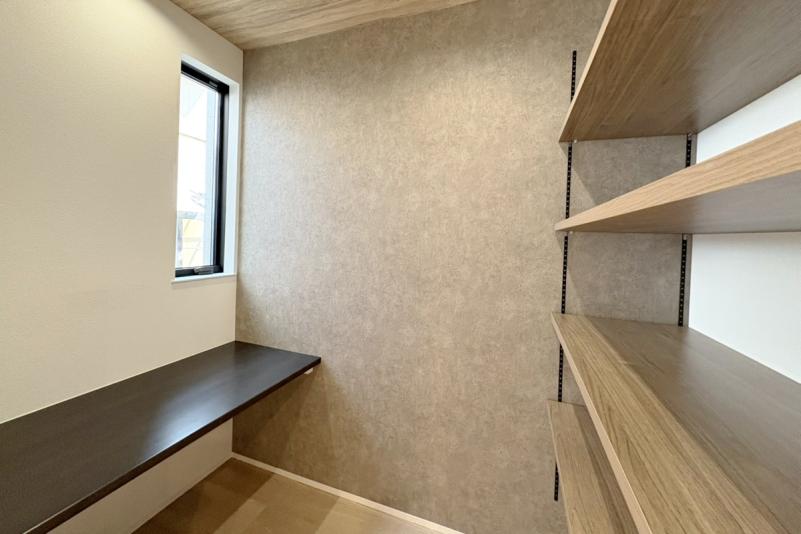 また、キッチン横には大容量のパントリーも完備。可動棚付きの広々とした設計で、食品やキッチン用品を“見せる収納”として美しく陳列できます。まるでお店のように整理できるので、どこに何があるのか一目でわかり、使い勝手の良さも抜群です。