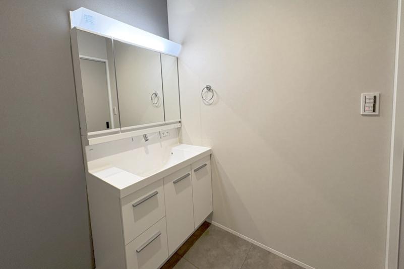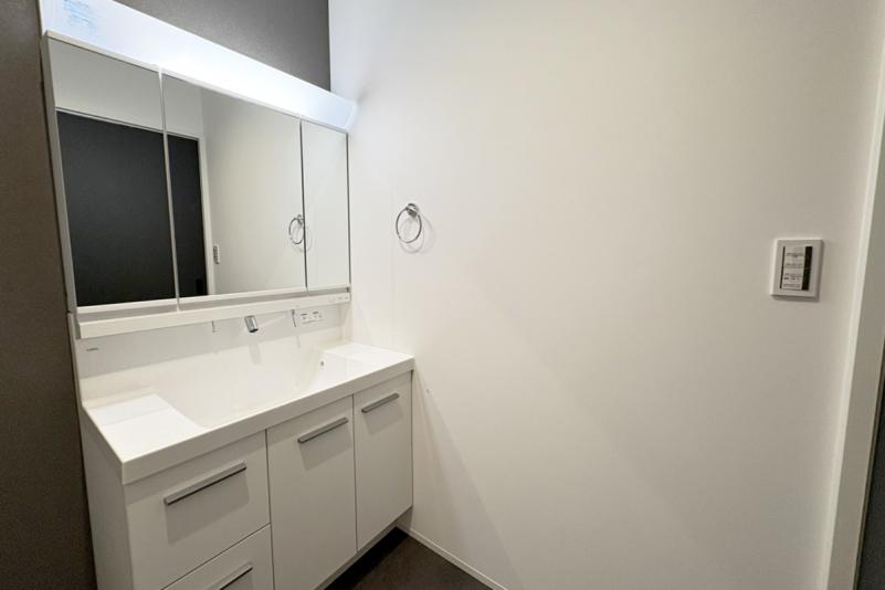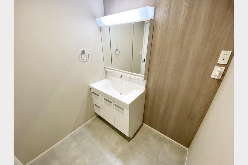 毎日使うハブラシなどの衛生用品や化粧品など、細かなものをそれらのきちんと収納できるミラーキャビネットはLEDライトでお顔映りもバッチリ。またキレイアップ水栓は、水栓が上部にあるので周りに水がたまりにくく、水滴を拭き取るだけで簡単キレイ。