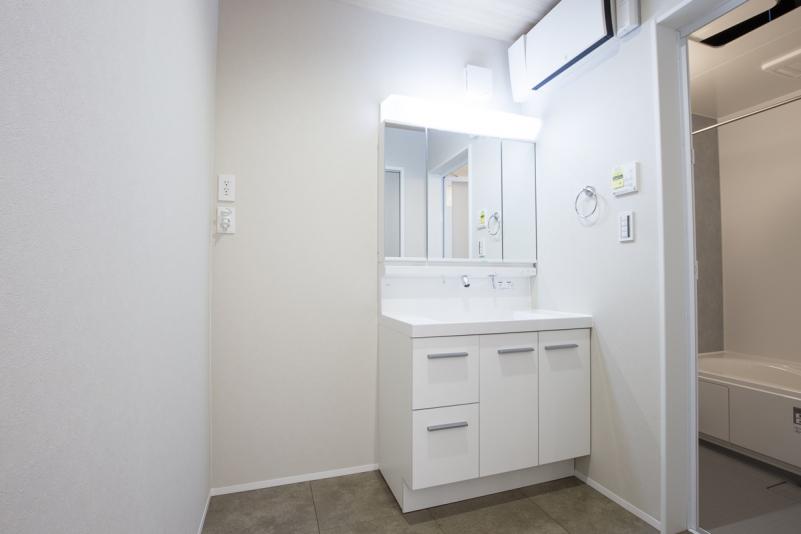 毎日使うハブラシなどの衛生用品や化粧品など、細かなものをそれらのきちんと収納できるミラーキャビネットはLEDライトでお顔映りもバッチリ。またキレイアップ水栓は、水栓が上部にあるので周りに水がたまりにくく、水滴を拭き取るだけで簡単キレイ。