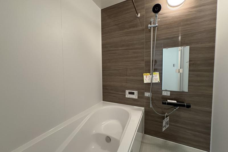 スイッチ付きのエコアクアシャワーはワンプッシュで吐水・止水が可能。まる洗いカウンターはワンアクションで折りたたんで壁にかけられ、洗い場を広く使えます。またマグネット式の収納マグネットシェルフも丸洗い可能!