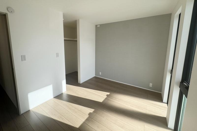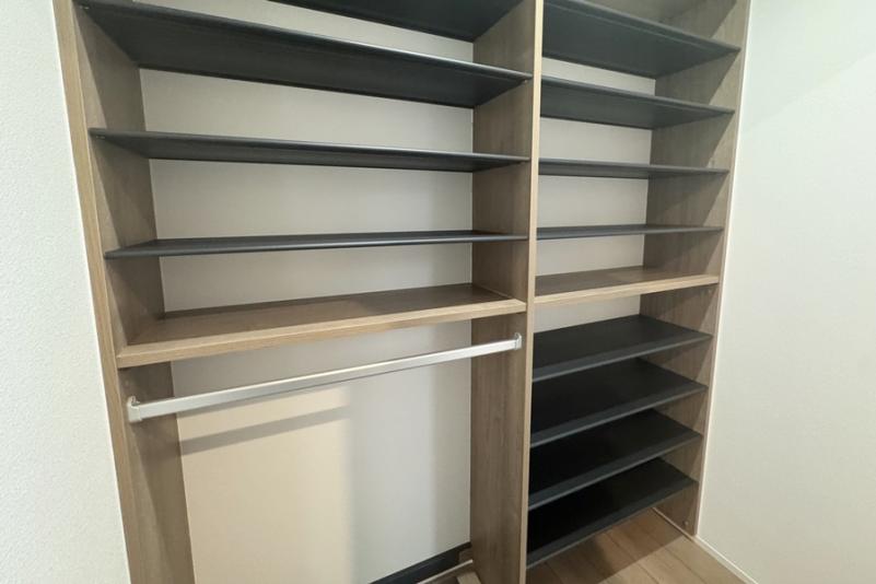アイランドキッチンの横にはパントリーがあり、食品等のストックに便利です。2階6帖の主寝室にはウォークインクローゼットを設置。お部屋の中をスッキリさせたい方におすすめです。