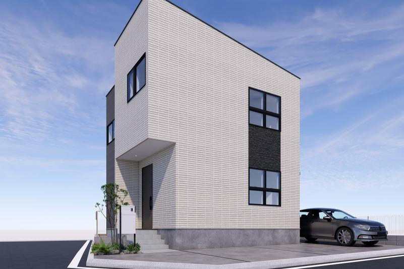 正面に並ぶ四つ窓が特徴的で、しっかり光も取り込める設計なので、室内も明るく開放的。シンプルだけど、ちょっと差がつくデザインです◎