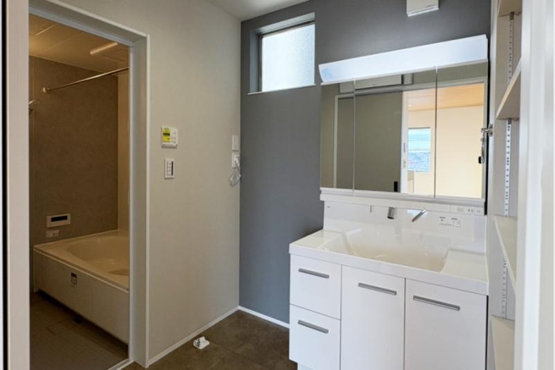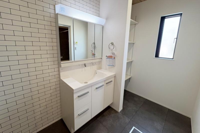 毎日使うハブラシなどの衛生用品や化粧品など、細かなものをそれらのきちんと収納できるミラーキャビネットはLEDライトでお顔映りもバッチリ。またキレイアップ水栓は、水栓が上部にあるので周りに水がたまりにくく、水滴を拭き取るだけで簡単キレイ。